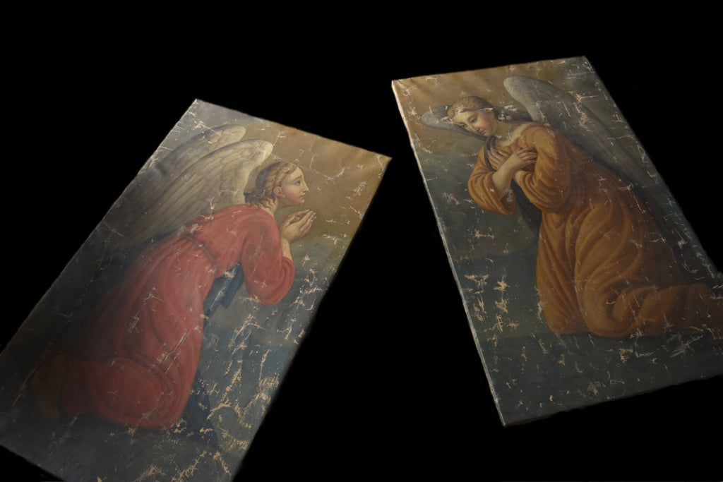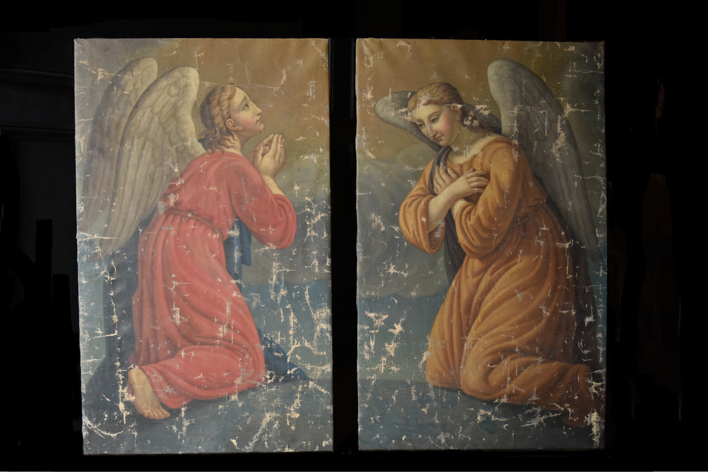 Pair of ecclesiastical 19th century French paintings of kneeling angels. Large scale oil on canvas. beautifully executed with wonderful muted colours.