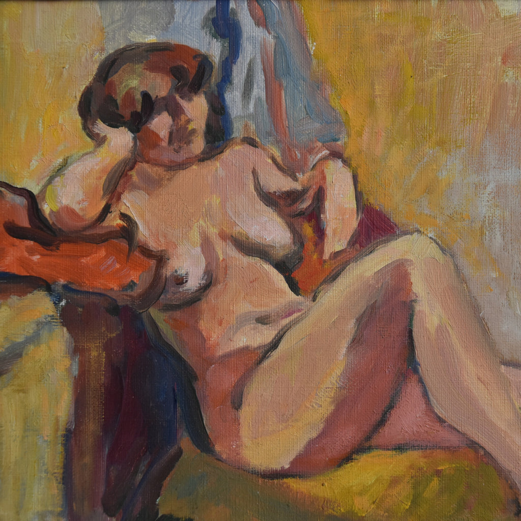 A French oil on canvas of a semi recumbent nude. Bright and pleasing artwork with a fantastic use of colour and tone.