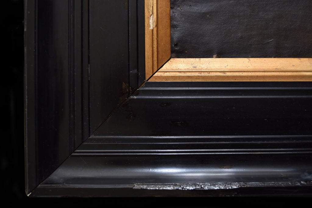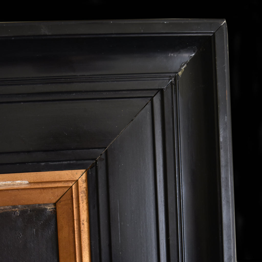 Mounted in a substantial (15cm wide) ebonised and gilt wood period frame .