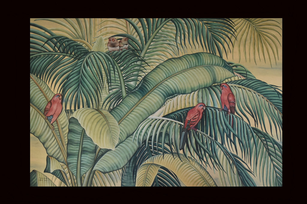 Large scale Balinese Botanical Painting of Parrots and finches. Circa 1970 'RESERVED'